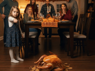 Durante la cena del Ringraziamento, mia figlia di cinque anni ha improvvisamente urlato, è corsa al tavolo e ha gettato l’intero tacchino a terra. Tutta la famiglia si è bloccata. Mi sono inginocchiata, cercando di mantenere la calma, e le ho chiesto: “Perché l’hai fatto?”. Lei ha ansimato, alzando le mani come se avesse appena salvato il mondo. “Perché ho salvato tutti!”. Nessuno ha capito…