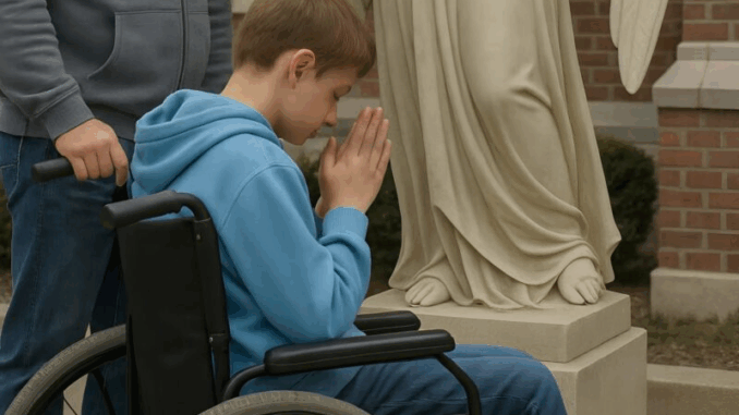 Ho fermato la sedia a rotelle e poi è successo qualcosa che non mi aspettavo affatto. Mio figlio ha unito le mani, ha chiuso gli occhi e ha iniziato a pregare. La sua voce tremava, ma ogni parola era sincera: