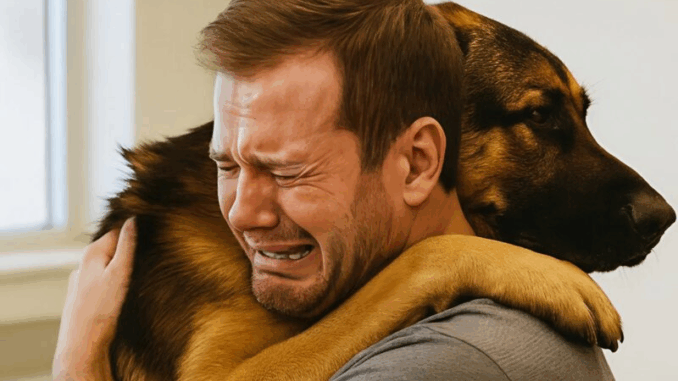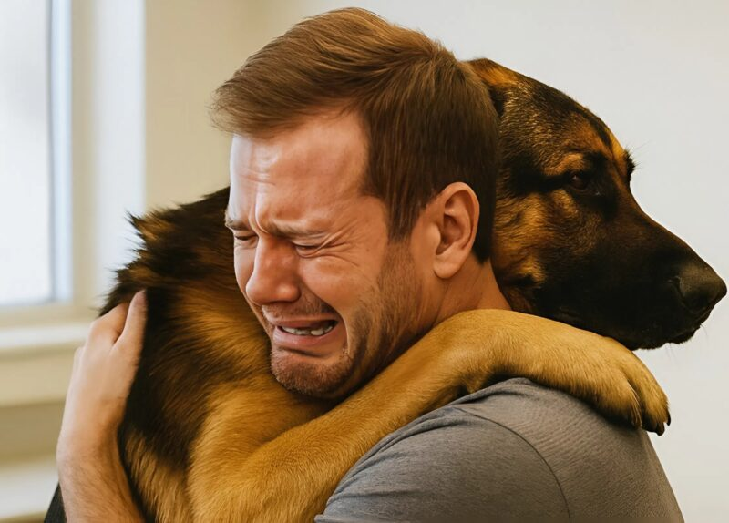 Il cane, come se avesse capito ogni parola, posò le zampe sulle spalle del padrone e si strinse a lui. L’uomo lo abbracciò forte e cominciò a piangere forte.