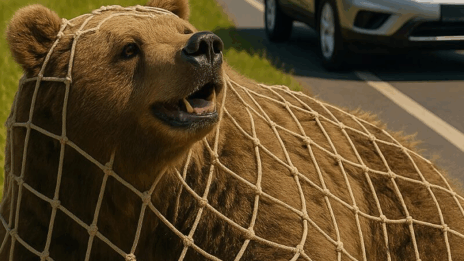 Il mio piede premette istintivamente l’acceleratore, ma a una seconda occhiata mi resi conto: l’orso non era lì seduto, era intrappolato in una grande rete. Le corde gli stringevano forte intorno alle spalle e alle zampe, il pelo era arruffato e l’animale respirava affannosamente, ringhiando come se chiedesse aiuto.