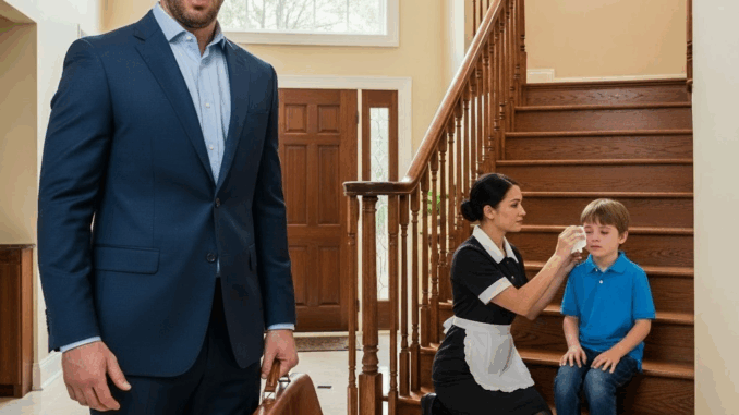 Entrò dalla porta principale con ancora in mano la valigetta. Sulle scale, suo figlio di otto anni, Oliver, sedeva rigido, con gli occhi azzurri illuminati dalle lacrime non versate. Un leggero livido gli ombreggiava la guancia. Inginocchiata davanti a lui, Grace, la badante della famiglia, gli tamponava con un panno fresco e una tenerezza che faceva sembrare l’intero atrio una cappella.