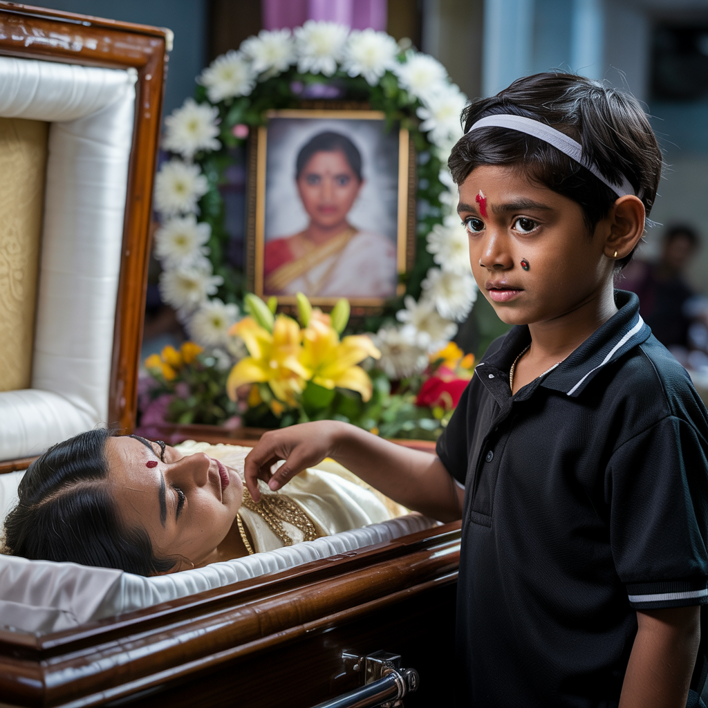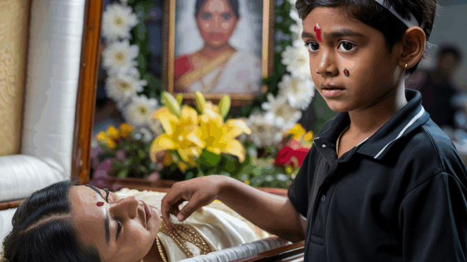 Il funerale si svolse rapidamente secondo le usanze del villaggio. Il fumo dell’incenso si mescolava a singhiozzi strazianti. La loro piccola casa era immersa nel dolore. Arjun sedeva in silenzio, con gli occhi infossati, stringendo un panno da lutto. I loro figli, dal più grande al più piccolo, erano inginocchiati accanto alla bara. Tra loro c’era il piccolo Aryan, il più piccolo, di soli cinque anni. Troppo piccolo per comprendere appieno la morte, eppure i suoi occhi pieni di lacrime guizzavano intorno come se cercassero qualcosa.