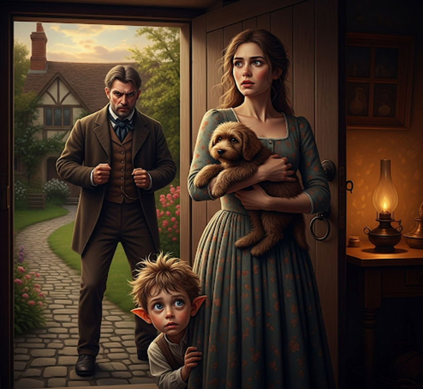 Prima che potesse reagire, un ringhio basso provenne dall’interno. L’uomo alto fuori spinse la porta all’improvviso, facendola inciampare e quasi cadere.