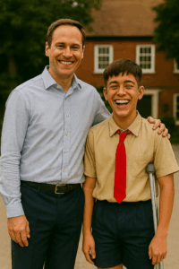 Tutto cambiò un’estate, quando il signor Sharma incontrò Aman , uno dei suoi studenti di seconda media, rannicchiato nel corridoio della scuola durante un acquazzone. La sua gamba sinistra era stata amputata sopra il ginocchio, coperta da una benda sporca. Accanto a lui c’era una piccola borsa di stoffa contenente solo pochi vestiti logori.