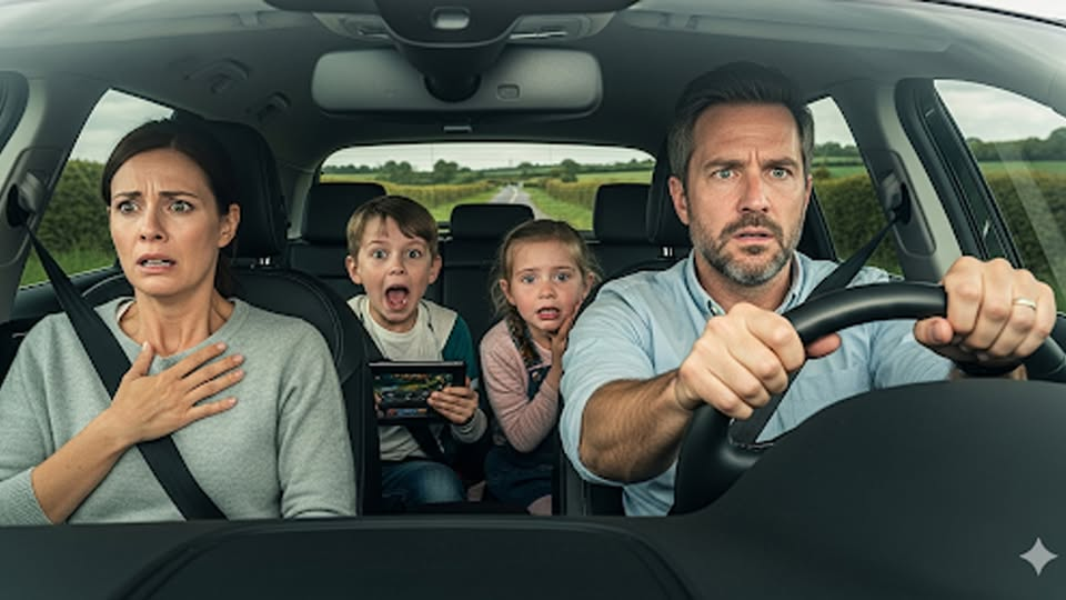 Lo faccio sempre, soprattutto perché detesto il modo in cui mio marito frena all’ultimo secondo possibile, e anche perché la cinetosi è uno dei miei tanti talenti. I bambini erano semi-incoscienti sul sedile posteriore, un po’ intenti a guardare un cartone animato e un po’ a litigare per le linee invisibili disegnate sui cuscini dei sedili. Tutti e tre, di 5, 7 e 10 anni.