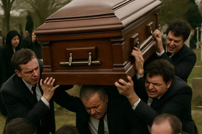 Quel giorno il meteo era in linea con l’umore: cielo grigio, aria umida e una leggera brezza che faceva ondeggiare gli alberi del cimitero. Tutto sembrava normale, come in altri funerali, finché otto uomini non dovettero sollevare la bara.