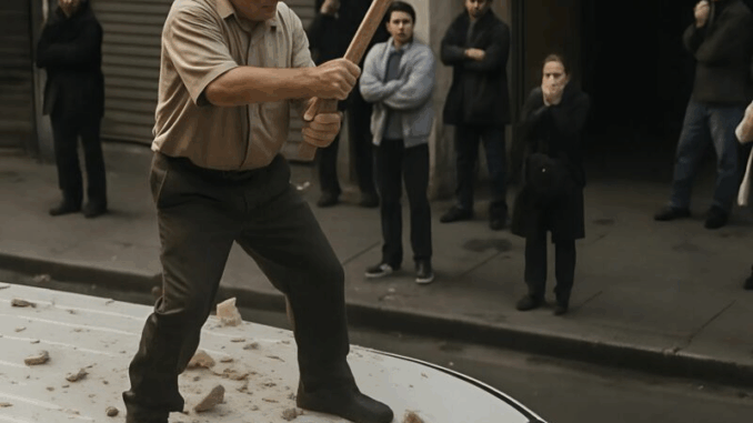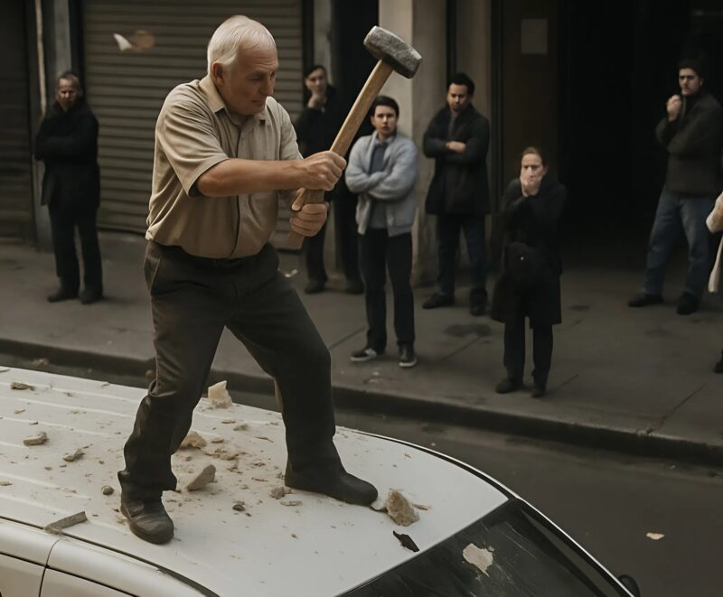 In una stretta strada del vecchio quartiere, si udì all’improvviso un suono acuto e sordo, come se qualcuno avesse colpito una spessa lastra di metallo con una forza incredibile. I passanti sussultarono e si voltarono. La fonte del rumore era ovvia: sul tetto di un furgone bianco c’era un uomo anziano con i capelli grigi, che impugnava un pesante martello con entrambe le mani.