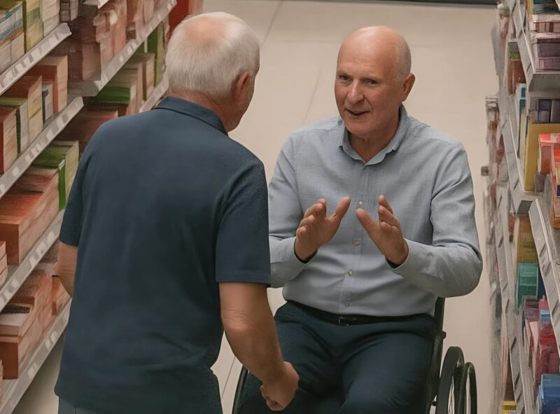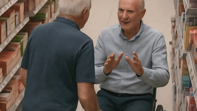 Stavo camminando tra le corsie, osservando attentamente i prodotti. Il cestino che tenevo in grembo era già mezzo pieno. Svoltando in un’altra corsia, ho urtato accidentalmente la ruota della mia sedia a rotelle contro il piede di un uomo che mi dava le spalle.