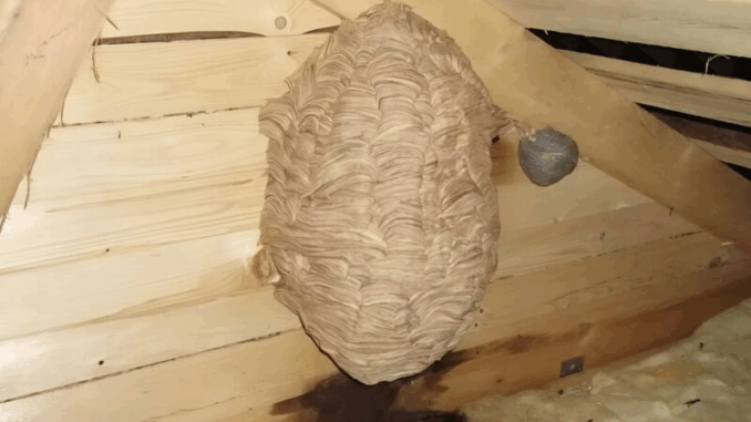 Oggi è successo di nuovo. Ma questa volta il suono era più persistente, più forte… e più vicino. Ho preso una torcia e sono salito lentamente. La soffitta era soffocante, con uno strano odore, dolciastro e sgradevole. All’improvviso, l’ho visto: proprio sul soffitto, vicino alla parete, pendeva un’enorme escrescenza grigio-gialla, come se fosse fatta di carta, con curiosi strati circolari. Era esattamente da lì che provenivano i suoni.