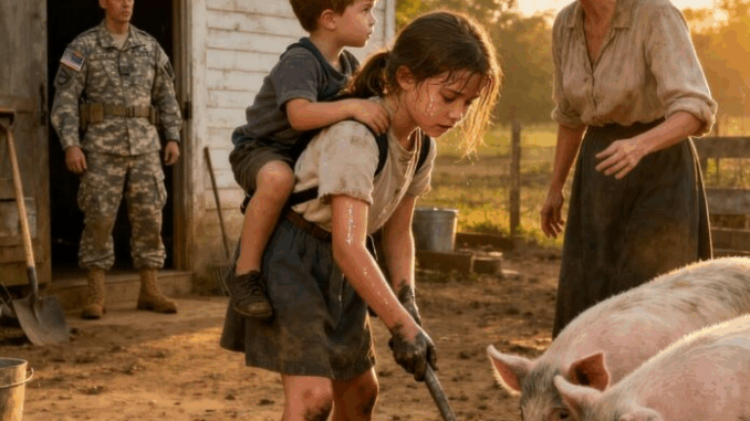 Emily, di soli nove anni, era dentro, e cercava di sollevare un pesante secchio di fieno, portando sulla schiena il piccolo Joshua di tre anni. Le sue manine erano screpolate, il maglione troppo grande e sporco. Joshua si aggrappava a lei come se avesse paura di lasciarla andare. Max stava in piedi, protettivo, vicino a loro, abbaiando forte come per difenderli dal mondo stesso.