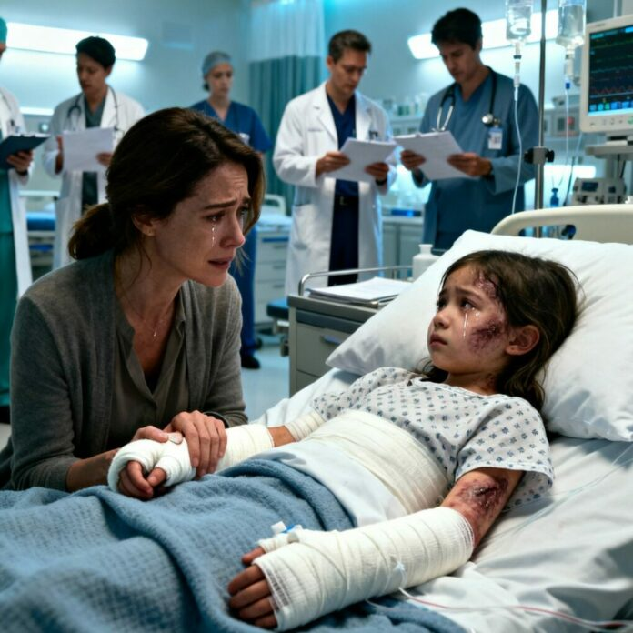 Quando arrivai all’ospedale, il mondo mi sembrò muto, come avvolto dal panico. Nella stanza 417, mia figlia di otto anni giaceva avvolta in strati di bende bianche, il suo corpicino inghiottito da fili e macchinari. Le sue guance erano rigate di lacrime secche.