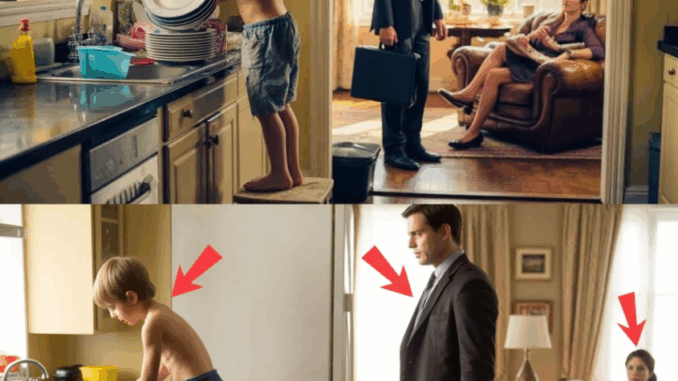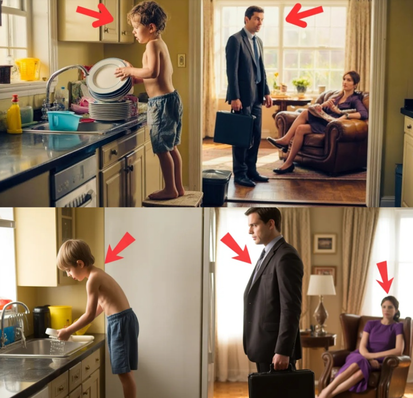 Le sue piccole mani erano rosse e gonfie, con evidenti tagli causati dai piatti rotti. Indossava abiti sporchi e bagnati, i capelli scompigliati e appiccicosi per il sudore. Intorno a lei c’erano secchi, stracci e prodotti per la pulizia, come se avesse lavorato per ore. Il pavimento della cucina splendeva, appena lavato. I piani di lavoro erano immacolati.