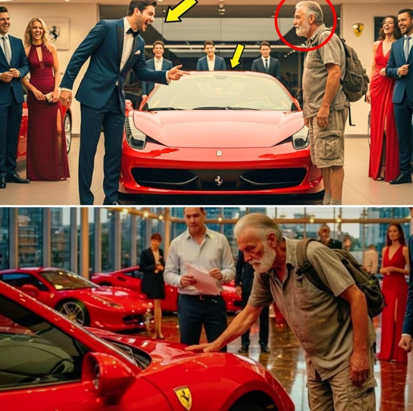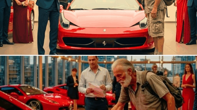 “Se puoi permetterti una Ferrari, te ne do due. Se puoi permetterti una Ferrari, te ne do due.” Il milionario sogghignò, la sua voce echeggiò sulle pareti di vetro della concessionaria. Seguì un coro di risate, come un’orchestra di disprezzo. In piedi davanti alla scintillante auto rossa, un uomo anziano con sandali e uno zaino consumato sostenne il suo sguardo senza abbassare la testa.