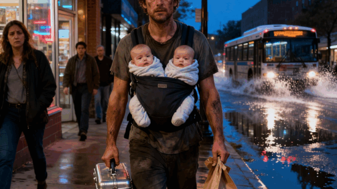 Le luci della città tremolavano contro un cielo livido di novembre mentre Daniel Brooks arrancava sul marciapiede crepato, con una mano che stringeva una cassetta degli attrezzi ammaccata e l’altra una sottile busta di plastica della spesa. Legati al petto c’erano i suoi figli gemelli, Matthew e Michael, di sei mesi, morbidi e addormentati, con le loro piccole teste premute contro la sua giacca da lavoro scolorita.