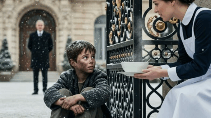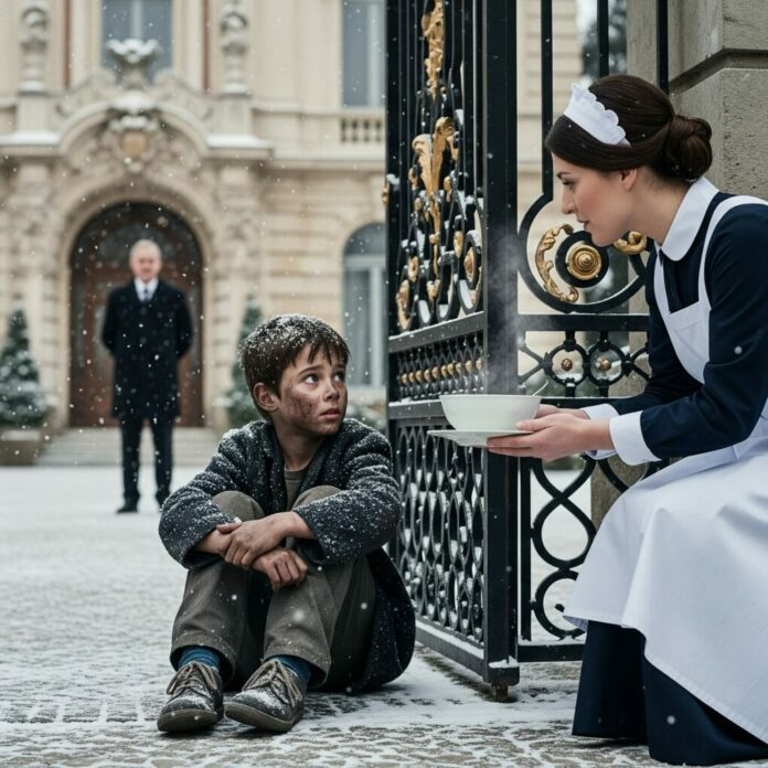 Era uno di quei pomeriggi grigi in cui il cielo sembrava così pesante da poter crollare. Claire Bennett, domestica della vasta tenuta Harrington a Boston, stava spazzando i gradini di marmo quando notò una piccola figura in piedi vicino al cancello in ferro battuto.