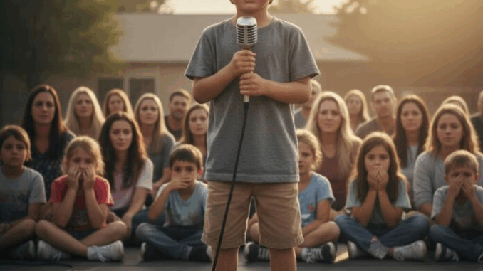 Il microfono sembrava pesante nelle piccole mani di Marcus, ma il peso non era paura, era responsabilità. Abbassò lo sguardo sulle scarpe malconce che aveva ai piedi, quelle con i lacci sfilacciati e i buchi vicino alle dita. Il petto gli si strinse, ma poi ricordò la voce di suo padre: “Sii coraggioso, figliolo”.