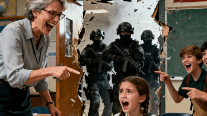 Rannicchiati nel buio, gli studenti ascoltavano il rumore sordo di stivali pesanti nel corridoio. Le urla esplosero e poi si zittirono. La porta dell’aula fu spalancata da una carica di irruzione e una squadra in assetto tattico fece irruzione. Laser rossi scandagliavano l’aula.