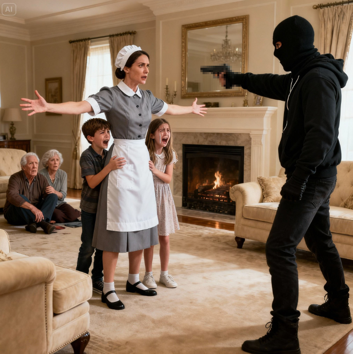 Ogni ospite, ogni bambino, ogni respiro terrorizzato rimase congelato. La donna che avevano creduto fosse solo una domestica se ne stava in piedi, con il petto che si sollevava, l’arma salda. Il capo gemeva sul tappeto sotto di lei, con il braccio piegato.