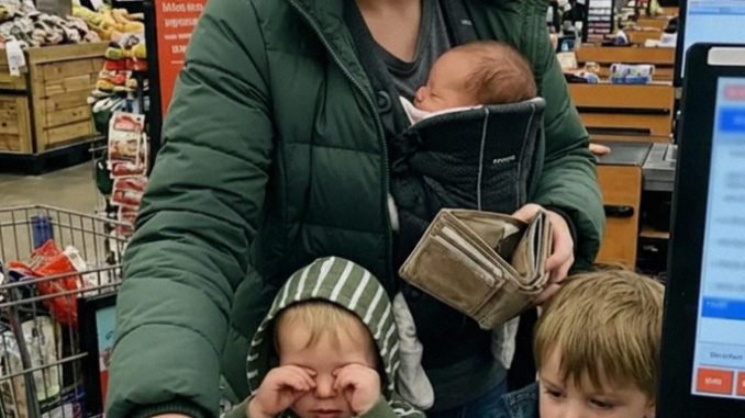Un bambino piccolo era seduto nel carrello e piangeva. Un bambino in età prescolare le si aggrappava alla gamba. Un neonato si dimenava in un marsupio legato al petto.