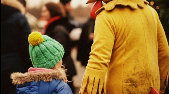 Davanti a me, mentre mi facevo strada tra un gruppo di famiglie vicino allo stand dei palloncini, ho visto una piccola figura che camminava mano nella mano con un uomo alto vestito con un ridicolo costume da pollo.