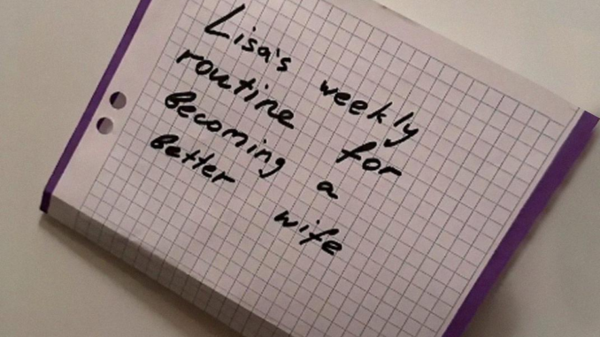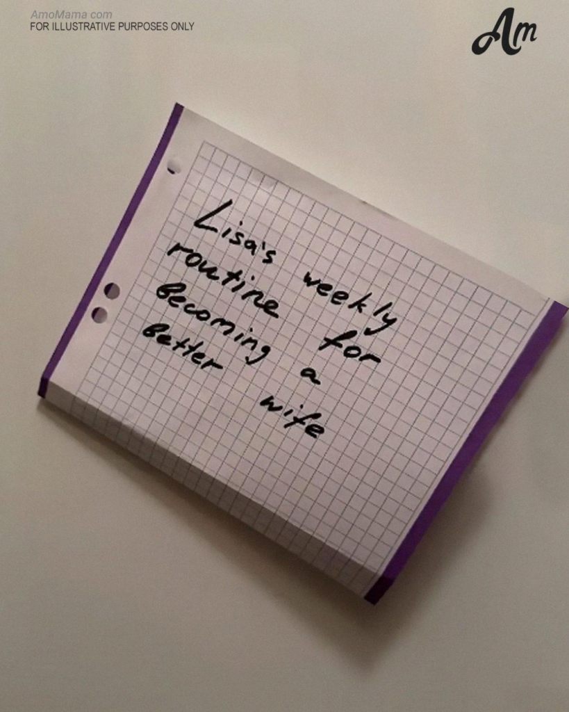 Fissai il foglio davanti a me. Era un programma… e in alto, in grassetto, c’era scritto “La routine settimanale di Lisa per diventare una moglie migliore”.