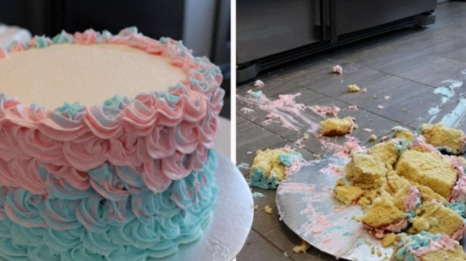 La torta, quella che aspettavamo di tagliare, quella che custodiva il segreto del sesso del nostro bambino, giaceva distrutta sul pavimento.
