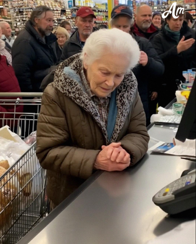 Davanti a noi c’era una donna anziana che sembrava avere quasi 70 anni. Aveva i capelli raccolti in uno chignon morbido, con ciocche argentate che le ricadevano vicino alle orecchie. Indossava un cardigan verde chiaro che sembrava molto amato, con i gomiti tesi per anni di utilizzo.
